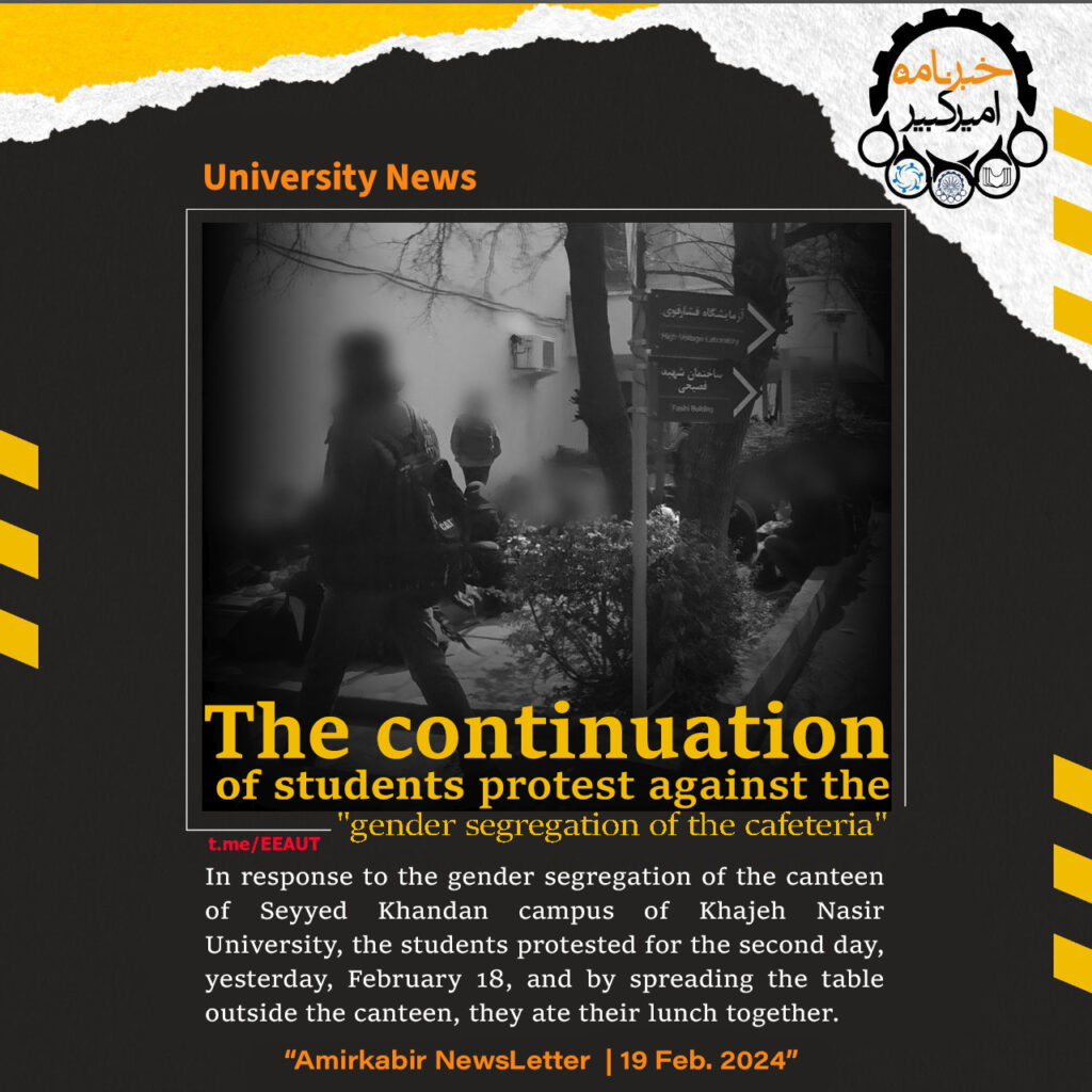Continuation of Khajeh Nasir University students’ protests against dining hall segregation In response to the gender segregation of the dining hall at the Seyyed Khandan campus, students staged a protest for the second day on February 17, 2024. They