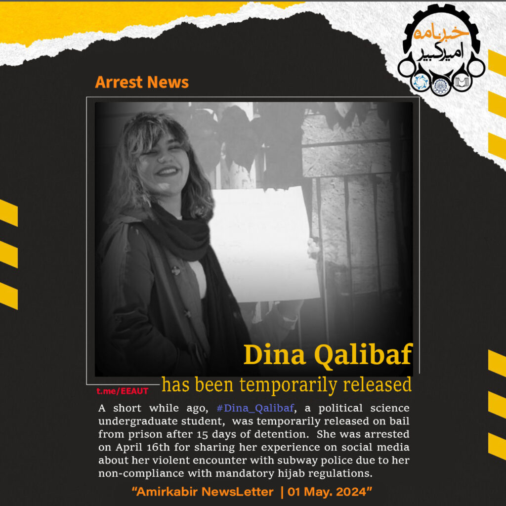 ساعاتی پیش دینا قالیباف دانشجوی کارشناسی علوم سیاسی که در روز ۲۸ فروردین به علت انتشار روایت بازداشت خشونتآمیز خود توسط پلیس مترو به دلیل عدم رعایت حجاب