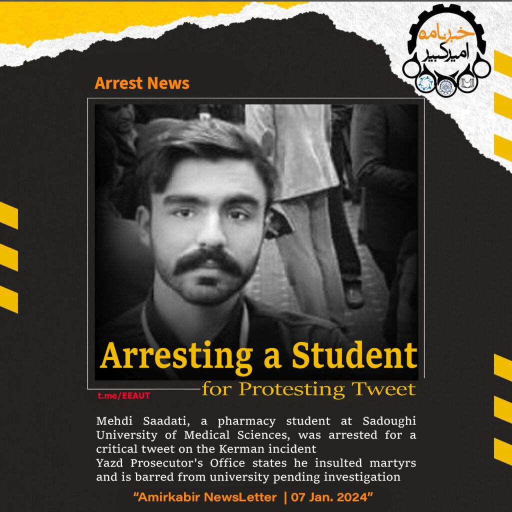 #مهدی_سعادتی دانشجوی داروسازی دانشگاه علوم پزشکی صدوقی به اتهام توییت انتقادی از حادثه رخ داده در کرمان بازداشت شد. به گزارش دادسرای عمومی و انقلاب یزد فرد توهینکننده