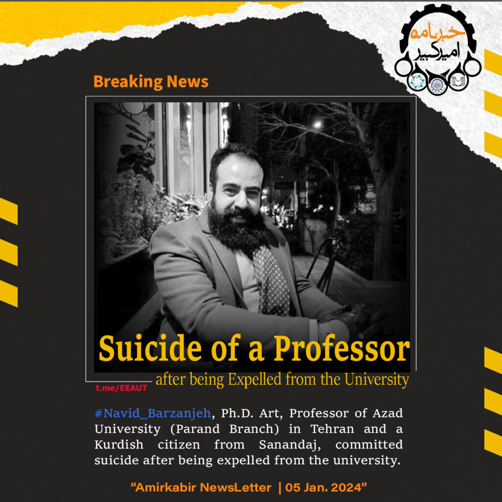 #نوید_برزنجه ، دکترای فلسفه هنر، استاد دانشگاه آزاد پرند در تهران و شهروند کُرد اهل سنندج در پی اخراج از دانشگاه با اقدام به خودکشی به زندگی خود