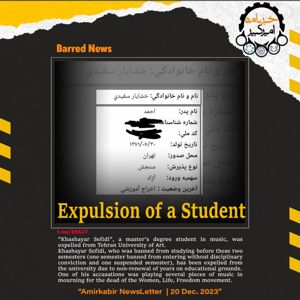 #خشایار_سفیدی دانشجوی رشتهی موسیقی دانشگاه هنر تهران، اخراج شد. این دانشجو که پیشتر به مدت دو ترم از تحصیل محروم شده بود با عدم تمدید سنوات به بهانههای
