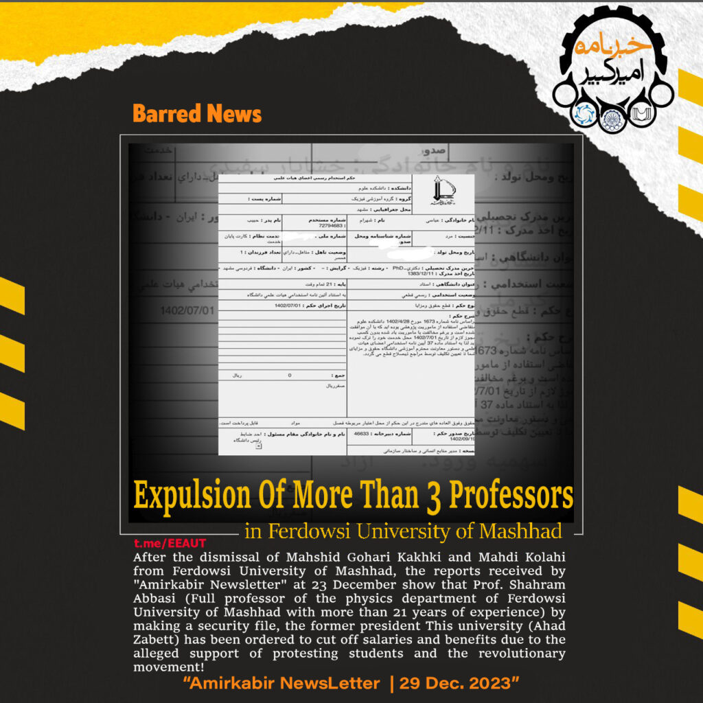 پس از اخراج مهشید گوهری کاخکی و مهدی کلاهی از دانشگاه فردوسی مشهد، حال گزارش های رسیده به خبرنامه امیرکبیر نشان میدهد که دکتر شهرام عباسی (استاد تمام