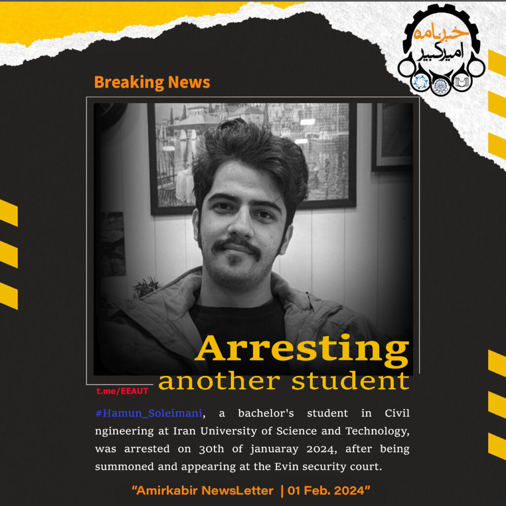 #هامون_سلیمانی ، دانشجوی کارشناسی مهندسی عمران دانشگاه علم و صنعت، روز گذشته مورخ ۱۰ بهمن ۱۴۰۲، پس از احضار و حضور در دادسرای امنیت اوین، بازداشت شد!