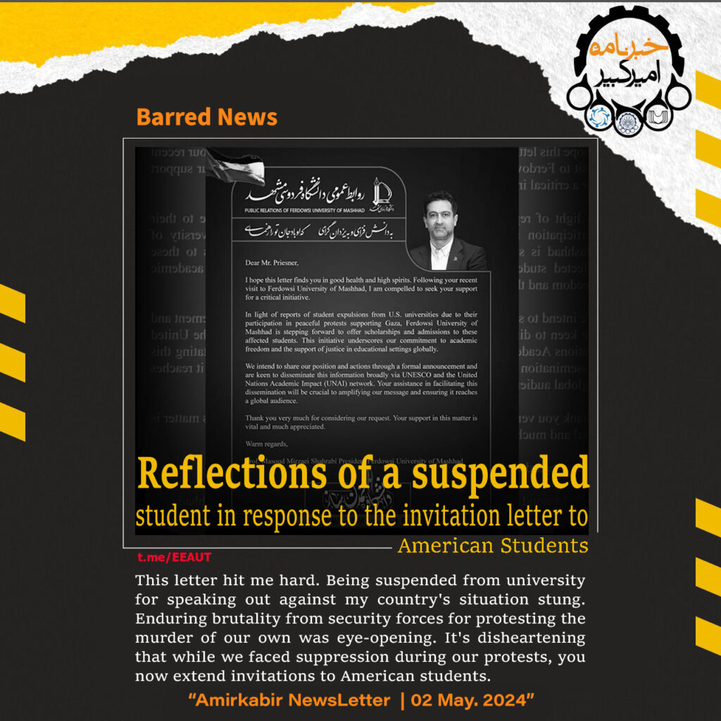 Reflections of a suspended student in response to the invitation letter from the president of Ferdowsi University of Mashhad (to American Students) This letter hit me hard. Being