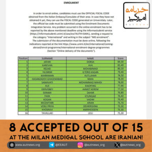 Eight of the fifteen admission quotas to Milan Medical School in the upcoming academic year are Iranian. October 15, 2024