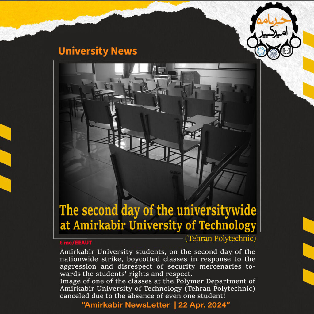 دومین روز اعتصاب سراسری در دانشگاه امیرکبیر (پلیتکنیک تهران) دانشجویان دانشگاه امیرکبیر در دومین روز اعتصاب سراسری، کلاسهای درس را در واکنش به تعرض و بی حرمتی مزدوران اداره حراست به حریم دانشجویان تحریم کردند. تصویر یکی